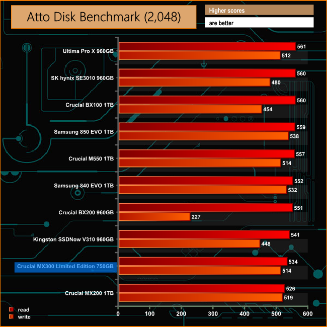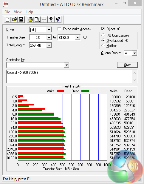 When tested with the ATTO benchmark, the drive confirmed the official sequential read/write figures of 530MB/s for reads and 510MB/s for writes. The read performance isn't going to set the world on fire as can be seen by the graph.
