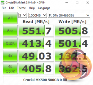 When it comes to handling small bity files, the Crucial BX300 just has the edge over the MX500 when it comes to reads but the situation is reversed when it comes to write performance. Looking at the two sets of benchmark results it seems that the Silicon Motion SM2258 controller has no real preference when it comes to the type of data it is being asked to handle.