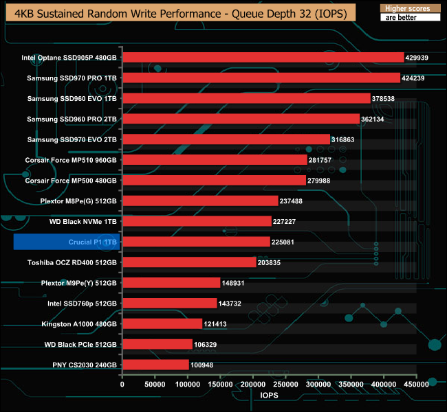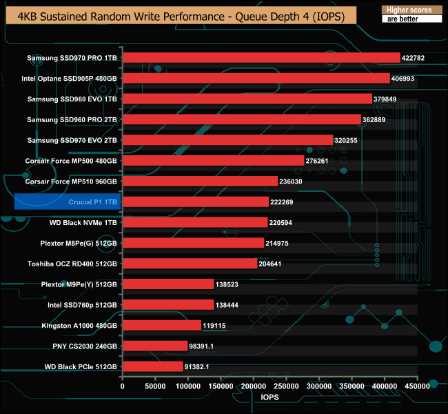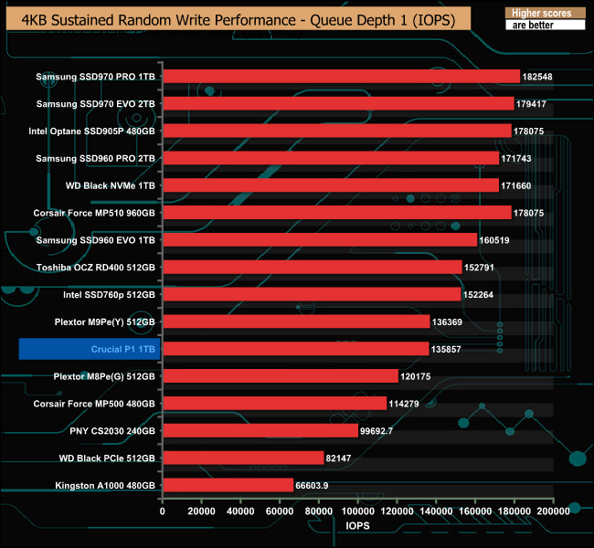 Crucial's latest SSD, the P1, is the company's first consumer drive with an NVMe interface and the second Crucial drive to use 3D Quad-Level Cell (QLC) , 4-bit per cell NAND (the first was the 5210 ION SATA enterprise drive). It uses a combination of Micron NAND and a Silicon Motion controller. At launch, the P1 range consists of just two capacities, 500GB and 1TB, but there is a flagship 2TB drive coming soon. Looking after the Micron 64-layer 3D QLC NAND is a Silicon Motion SM2263EN 4-channel controller, and in the case of the 1TB drive there is 1GB of DDR3 cache. Crucial quote Sequential performance figures for the 1TB drive as up to 2,000MB/s for reads and up to 1,700MB/s for writes. The 500GB drive is rated at 1,900MB/s reads and 905MB writes, while the 2TB drive is listed at the same 2,000MB/s reads as the 1TB drive but with a faster write figure of 1,750MB/s. Random 4K performance for the 1TB drive is stated as up to 170,000 IOPS for reads and 240,000 IOPS for writes. The 500GB drive is rated at 90,000 IOPS for reads and 220,000 IOPS for writes, while the 2TB drive has a 250,000 IOPS figure for both reads and writes. Crucial quotes an endurance figure for the 1TB drive of 200 TBW which works out at around 1,093GB of writes per day for the total length of the 5-year warranty Crucial backs the drive with. Quad-Level Cell NAND After SLC (1 bit per cell), MLC (2 bits per cell) and TLC (3 bits per cell), comes the latest leading edge NAND technology, Quad-Level Cell (QLC) with 4 bits per cell. While QLC NAND has obvious advantages in terms of storing more bits of data per cell (an increase of 33% over TLC ) and at lower cost, there are a couple of significant hurdles to overcome in terms of performance and endurance. Performance When NAND is programmed or erased, electrons are sent through an insulator by the application of a voltage. The location and number of electrons is the determining factor for when the current will flow between a source and a sink (voltage threshold) which determines what combination of 1s and 0s (data) is stored in the cell. With SLC NAND this is pretty straight forward as only a 1 or a 0 is being stored. QLC NAND ups the ante considerably as now there are four 0 or 1 states per cell, giving a total of 16 different possible combinations per cell which in turn means 16 different voltage levels to control. As more data is able to be stored in a cell there is a corresponding drop in performance as the cell contents must be read before any writes can commence as the previous bit value in the cell must be recognised first. The corresponding changes in voltage to enable the change in bit state causes instability in the surrounding cells. With QLC NAND's 16 different voltage levels this needs very careful programming to ensure adequate precision during read and write operations. QLC NAND supporting controllers have to have high level error correction capabilities to help overcome these problems, but all these actions mean slower NAND access than previous generations of NAND. To offset the drop in performance due to the length of time it takes to program a QLC NAND block, QLC drives are going to be relying on SLC caching technology a lot more than even TLC NAND does to raise the performance levels of the drive up to what you might expect of an NVMe drive. Endurance Every time data is written to NAND, the cell gets slightly damaged which is why NAND has a finite life or endurance. SLC has a life of around 100,000 P/E (program/erase cycles), MLC 10,000 P/E and TLC approximately 3,000 P/E (thanks to manufacturers striving to keep improving the life of TLC NAND). When QLC was first mooted, the endurance figure often quoted was just 100 P/E, a figure so low it caused many people to question whether the technology would ever see the light of day. As with TLC NAND, manufacturers have been working hard to get the P/E figure of QLC NAND up to more usable levels, Micron currently quotes a figure of 1,000 program/erase cycles. Physical Specifications: Usable Capacities: 1TB NAND Components: Micron 64-layer 3D QLC NAND NAND Controller: Silicon Motion SM2263 Cache: 1GB DDR3 Interface: NVMe 1.3 PCIe 3.0 x4 Form Factor: M.2 2280 Dimensions: 22 x 80 x mm Firmware Version: P3CR010. The drive comes in a box without any image on the drive on the front or back. On the bottom left hand side of the box front is the drive's capacity. The rear of the box has three icons for Data Transfer Software (Acronis True Image HD 2015), Installation Guide and Firmware update which are all available via Crucial’s SSD support web page. The only thing in the box beside the drive is a setup / warranty information pamphlet. Crucial's P1 is built on a standard M.2 2280 format with all the components housed on one side of the PCB. Sitting under the label (a plain label without any copper layer) are two packages of Micron 64-layer 3D QLC NAND, a single 1GB DDR3 IC and the Silicon Motion SM2263EN controller. Silicon Motion's SM2263EN is a four channel controller that supports the NVMe 1.3 specification and can be used in conjunction with DDR3, DDR3L, LPDDR3 or DDR4 cache. It also supports full drive encryption with AES and TCG Opal protocols. Crucial’s Storage Executive is a pretty comprehensive SSD toolkit. With it you can check the drive’s S.M.A.R.T data, update the firmware, see how the drive’s capacity is being used, monitor the drive’s operating temperature and overall health, adjust the Over Provisioning and enable the Momentum Cache feature. There's also some options in the software that aren't supported by the P1; resetting the PSID, Flex Capacity (improve's endurance) and Device Self-Test. For testing, the drives are all wiped and reset to factory settings by HDDerase V4. We try to use free or easily available programs and some real world testing so you can compare our findings against your own system. This is a good way to measure potential upgrade benefits. Main system: Intel Core i7-7700K w