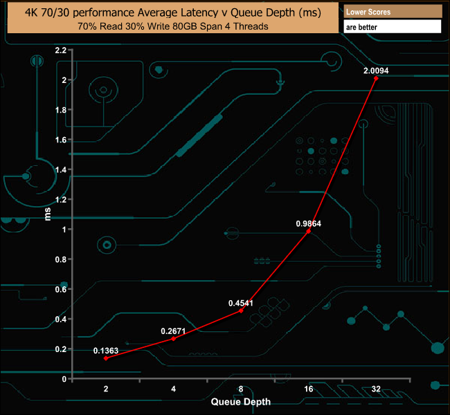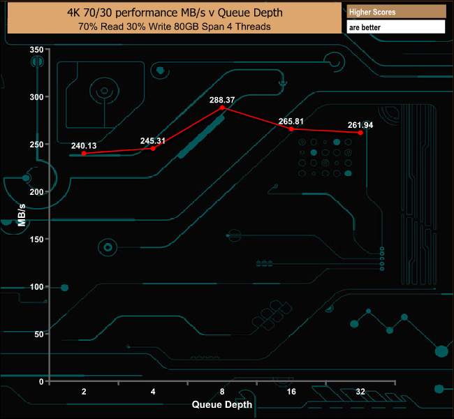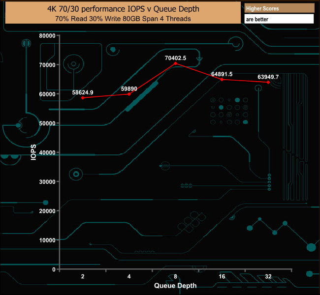 In our 70/30 read/write mix test, the drive's performance peaked at the QD8 mark at 70,402 IOPS before falling back to finish the test run at 63,949 IOPS.