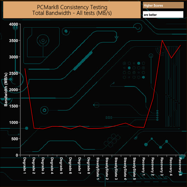 Overall the P1's performance gets hit very hard during the Degradation and Steady State runs of the PCMark 8's Consistency test as the SLC buffer gets smaller as the drive is filled with data. However, the drive's recovery from the ordeal is very good indeed – although not consistent.