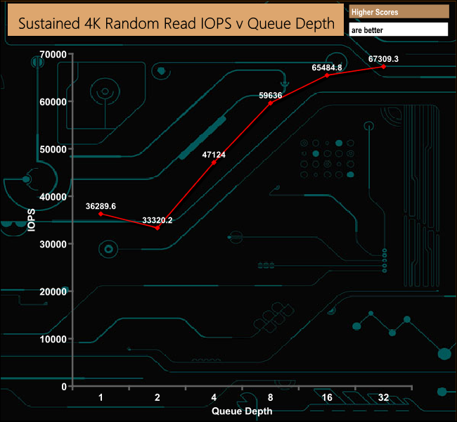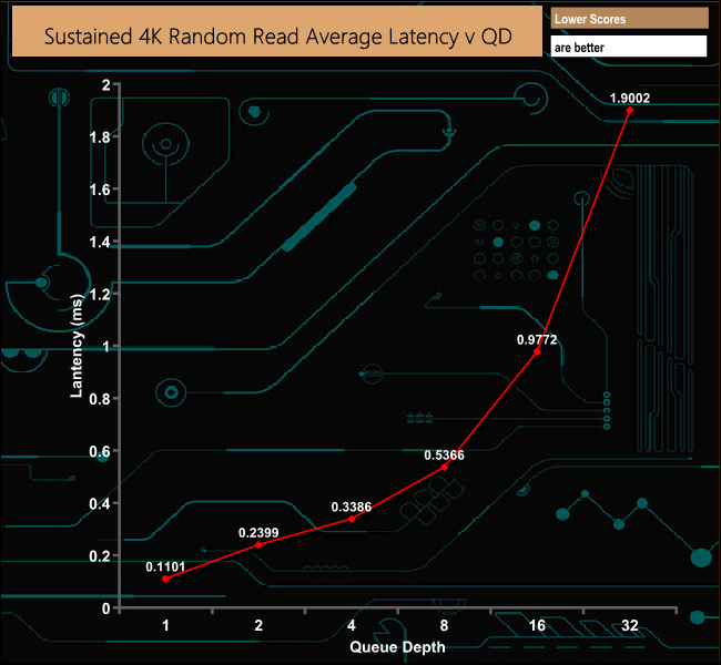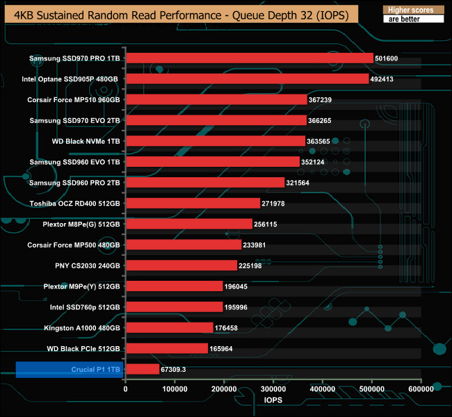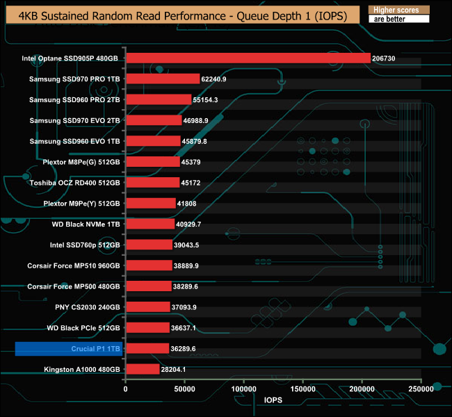 The Crucial P1 didn't perform too well in our sustained 4K random read test, sitting at the bottom of the comparison graphs in all but the QD1 test.