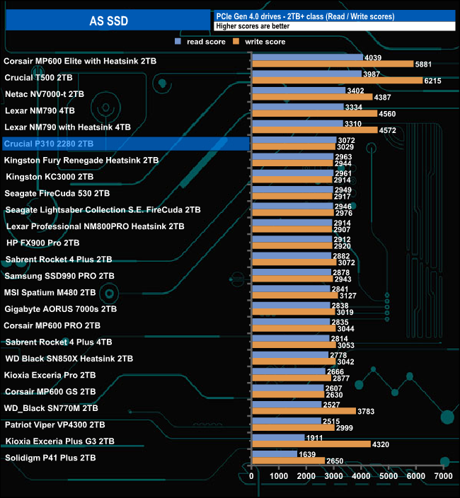 The AS SSD read score of 3072 sees Crucial's P310 2280 drive in sixth place in the results chart but at 3029 its write performance is also pretty strong.