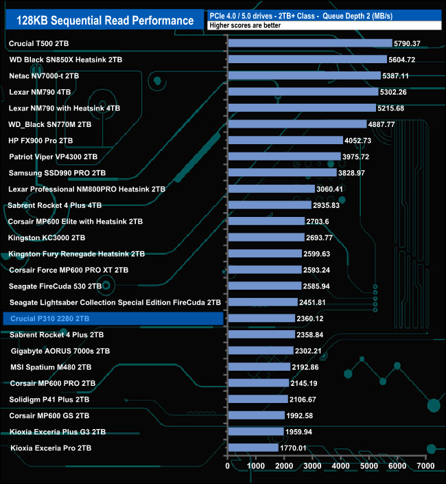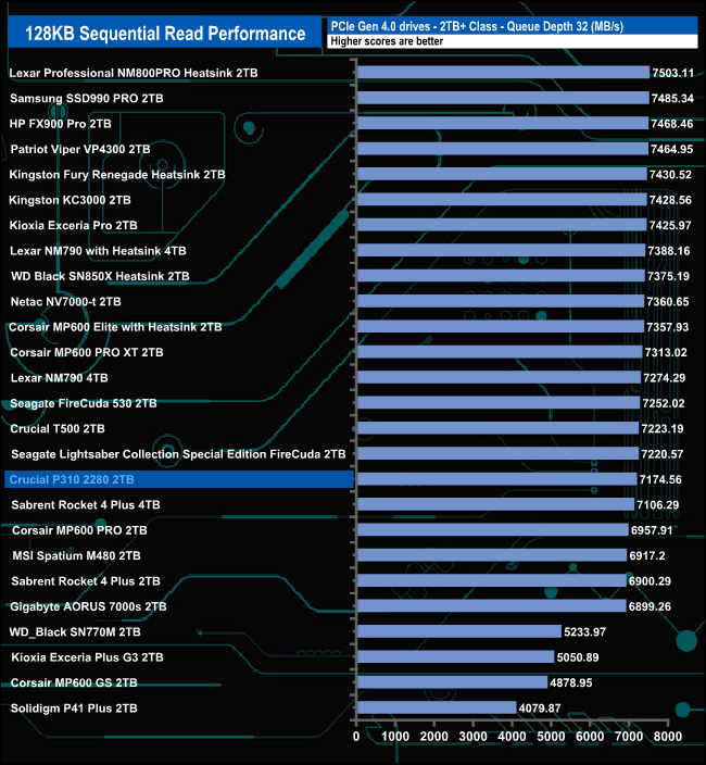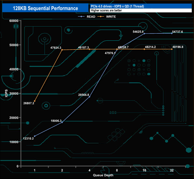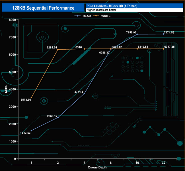 We used CrystalDiskMark 8‘s custom settings to test the Sequential read and write performance of the drive through a range of queue depths. The setup for the tests is listed below.
