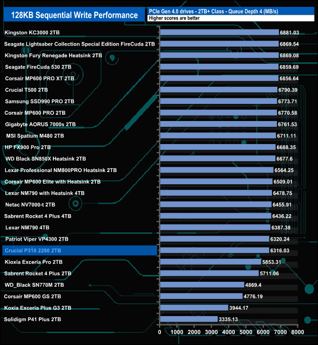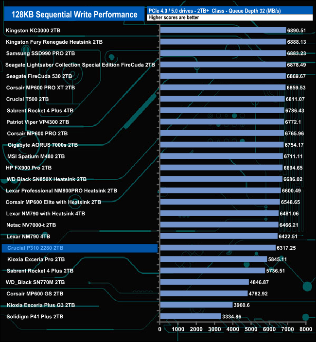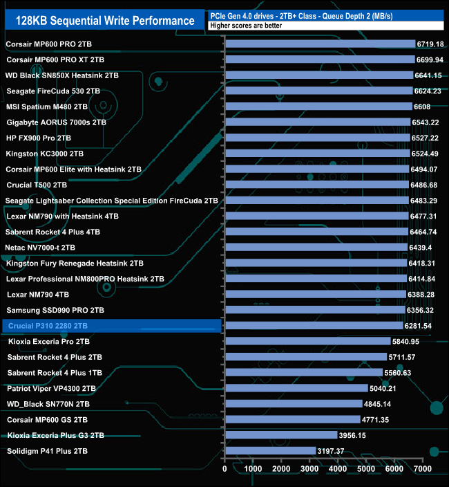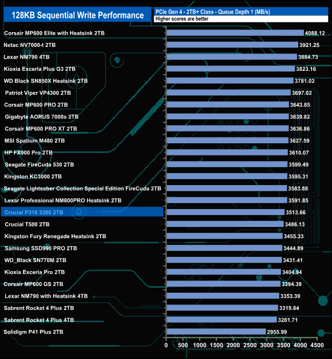 As with the Sequential read results the write performance sees the drive in the bottom half of the table with the best performance coming at QD1.