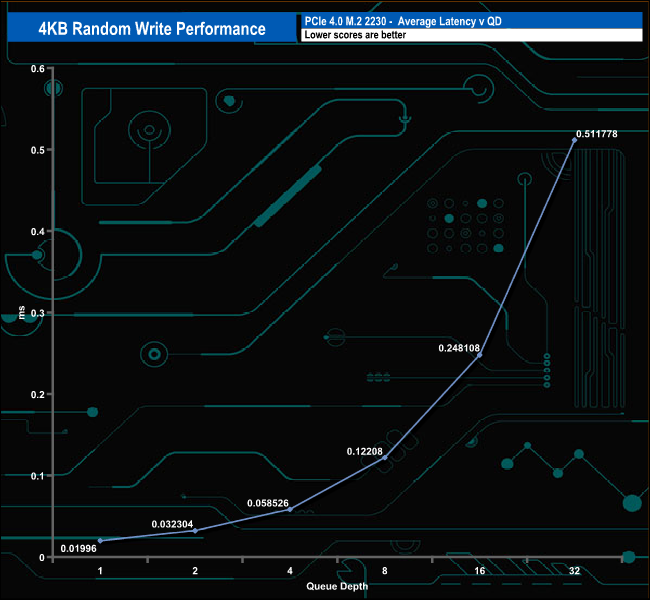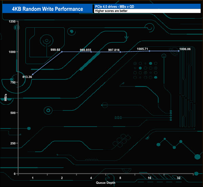 We used CrystalDiskMark 8‘s custom settings to test the 4K random write performance of the drive through a range of queue depths. The setup for the tests is listed below.