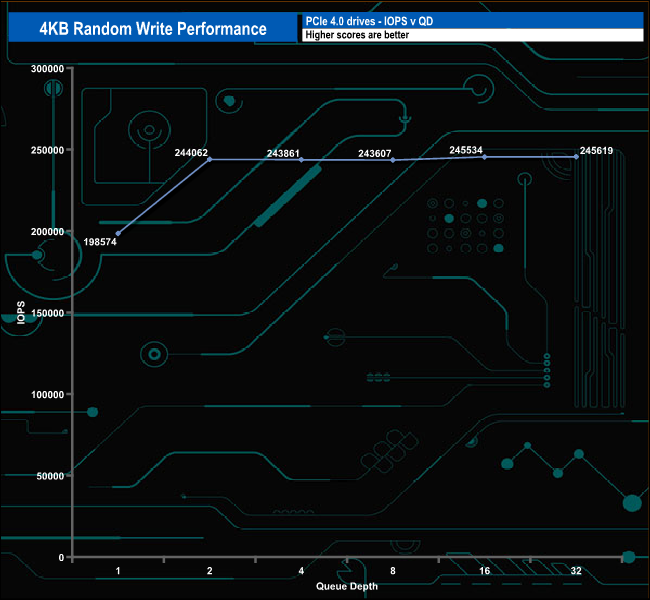 As with our 4-threaded random 4K read testing, we couldn't get close to the official rating of 1,200,000 IOPS in our random write tests. The best we saw was 245,619 IOPS (1,006MB/s) at QD32.