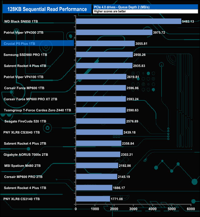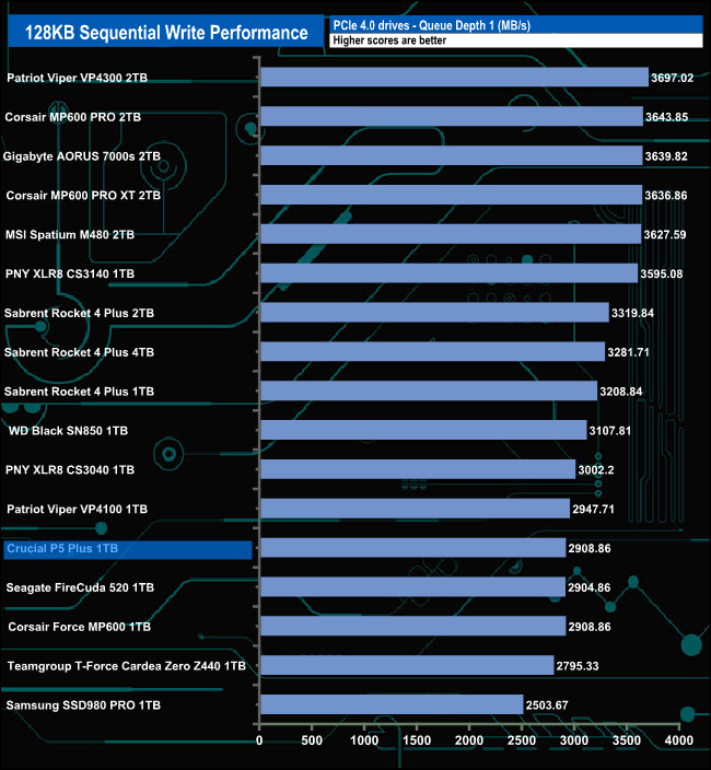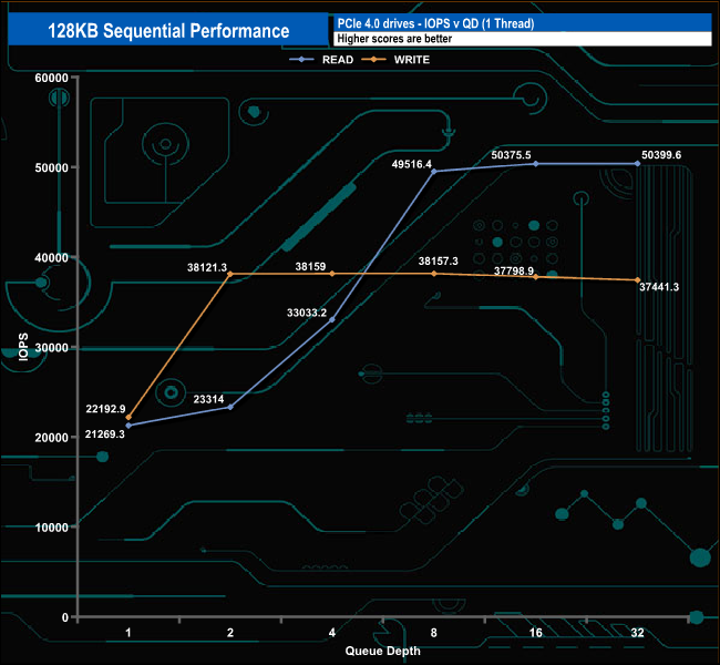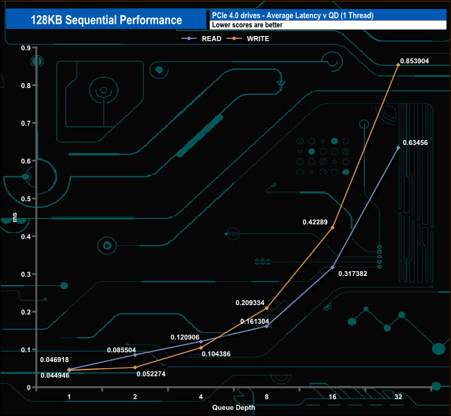 At QDs 1,2 and 4 the drive sits in the top five of the Sequential read results charts but at QD32, the drive sinks to the bottom half of the table.