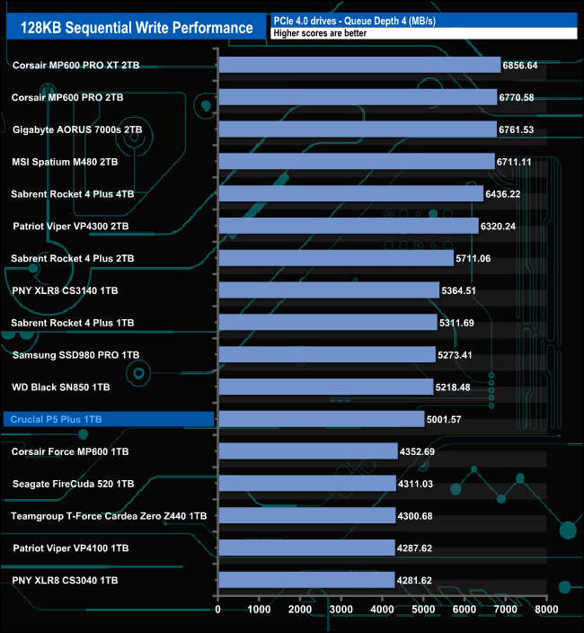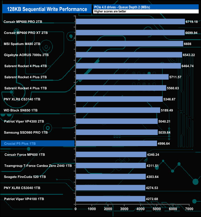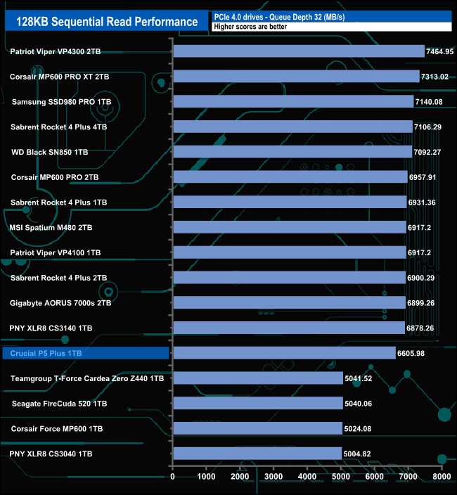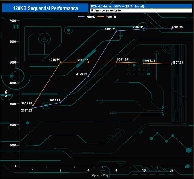 In our own Sequential tests, we saw a peak read score of 6,605.98MB/s (QD32) which confirmed the official read figure. The best-tested write result was 5,001.57MB/s (QD4) again confirming the official 5,000MB/s.