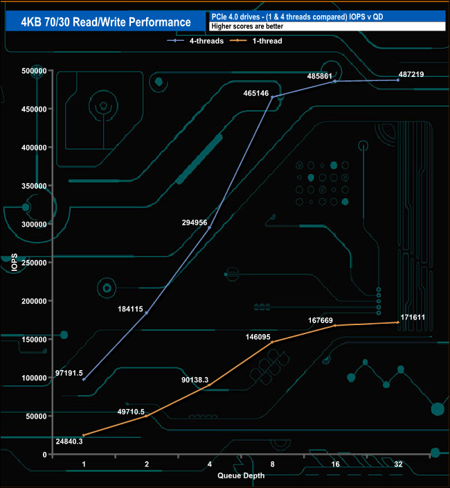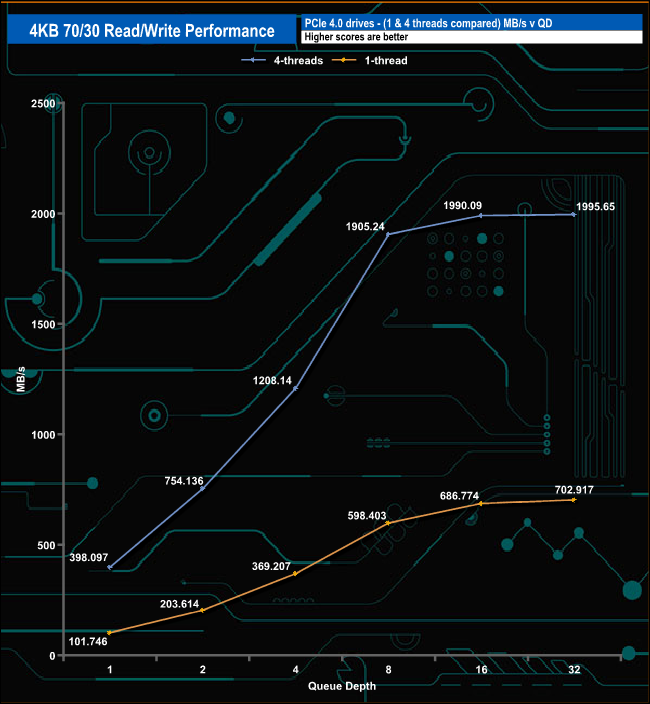 We used CrystalDiskMark 8’s custom settings to test the 4K 70/30 mixed read/write performance of the drive through a range of queue depths using a single thread and four threads.