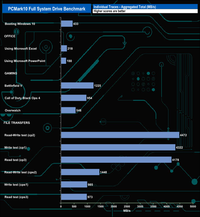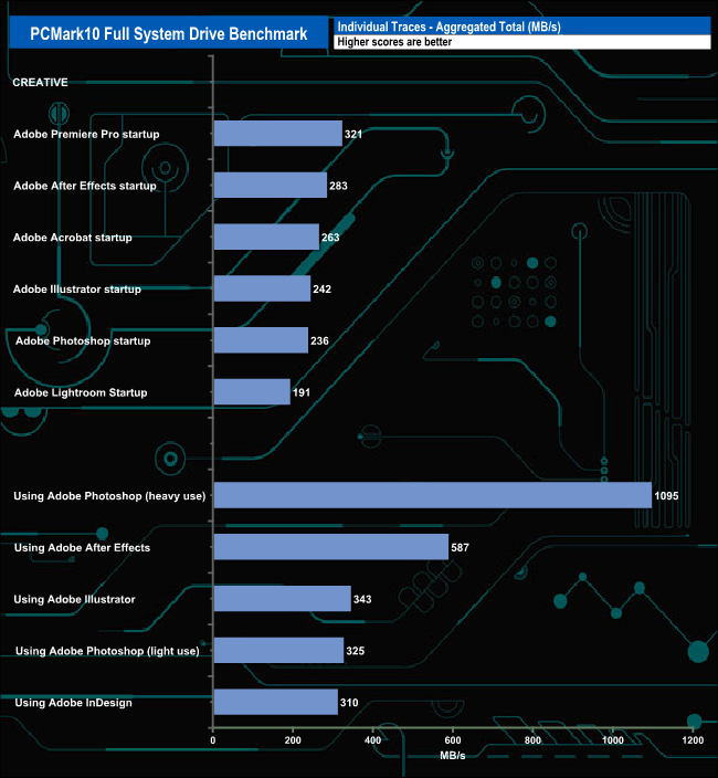 The PCMark 10 Full System Drive Benchmark uses a wide-ranging set of real-world traces from popular applications and common tasks to fully test the performance of the fastest modern drives. The benchmark is designed to measure the performance of fast system drives using the SATA bus at the low end and devices connected via PCI Express at the high end.