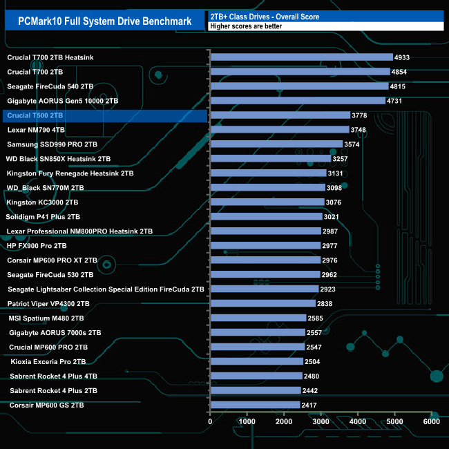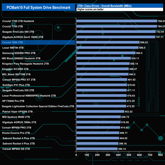 With an overall bandwidth figure of 599.03MB/s, the 2TB Crucial T500 slots into the fifth spot on the results chart but it is the fastest consumer Gen 4 drive we've seen in this test.
