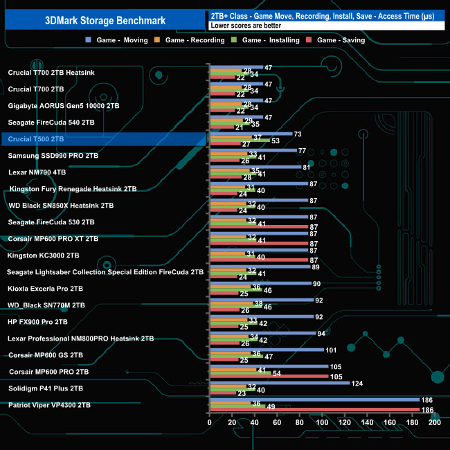 In 3DMark’s Storage Test, the 2TB T500 had an average game loading bandwidth figure for the three games of 975.71MB/s which is the fastest average for a Gen 4 drive with an average access time of 56µs.