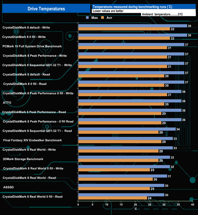 We did our standard testing using the hefty built-in heatsink on our Gigabyte AORUS X670E Xtreme motherboard. During our benchmarking runs, the hottest the drive got was 38° C during the CrystalDiskMark 8 Write test and the 0 fill Write test. For the non-4 K tests the drive averaged 34° while for the 4K-based tests, the average was 31°C.