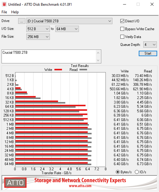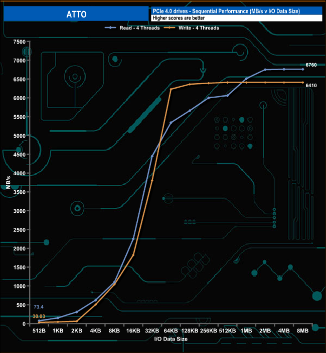 Using the ATTO benchmark writes begin to plateau out at the 512KB mark with a figure of 6,410MB/s. Reads begin to level off after the 2MB mark at 6,750MB/s.
