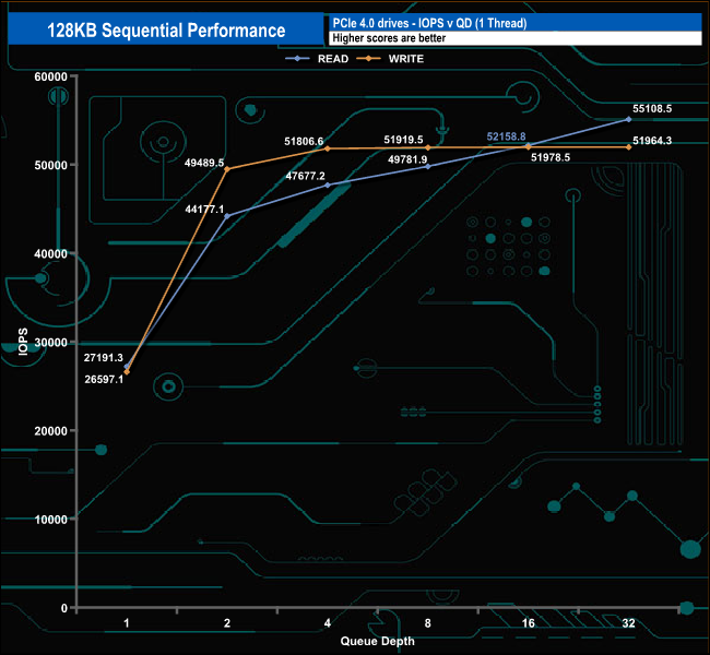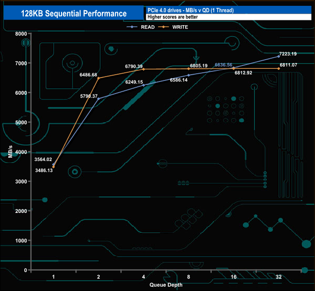 We used CrystalDiskMark 8‘s custom settings to test the Sequential read and write performance of the drive through a range of queue depths. The setup for the tests is listed below.