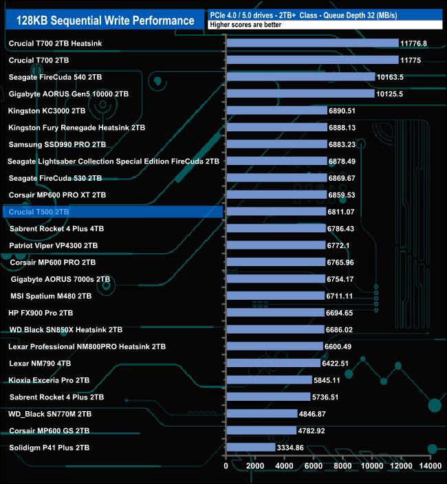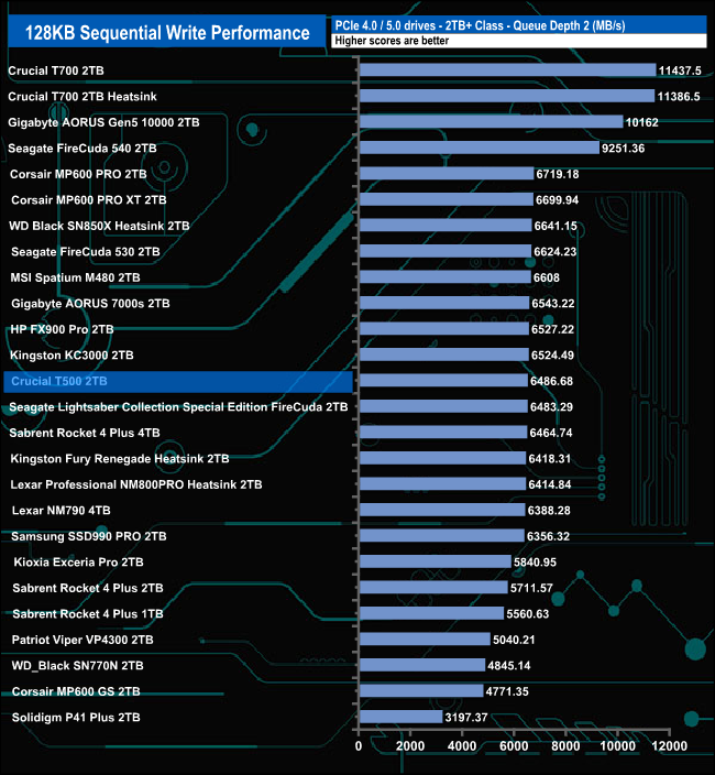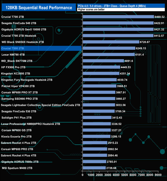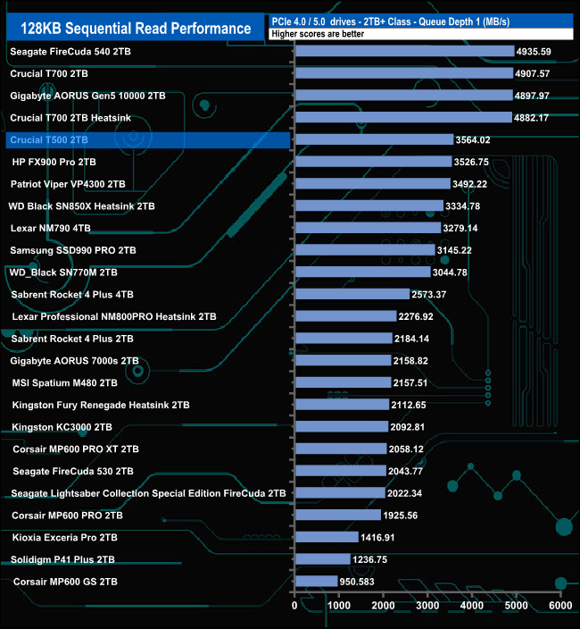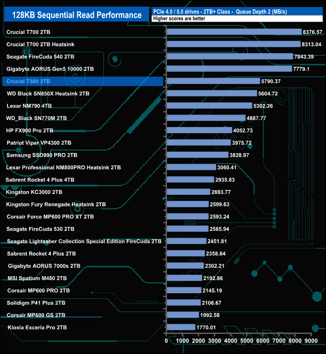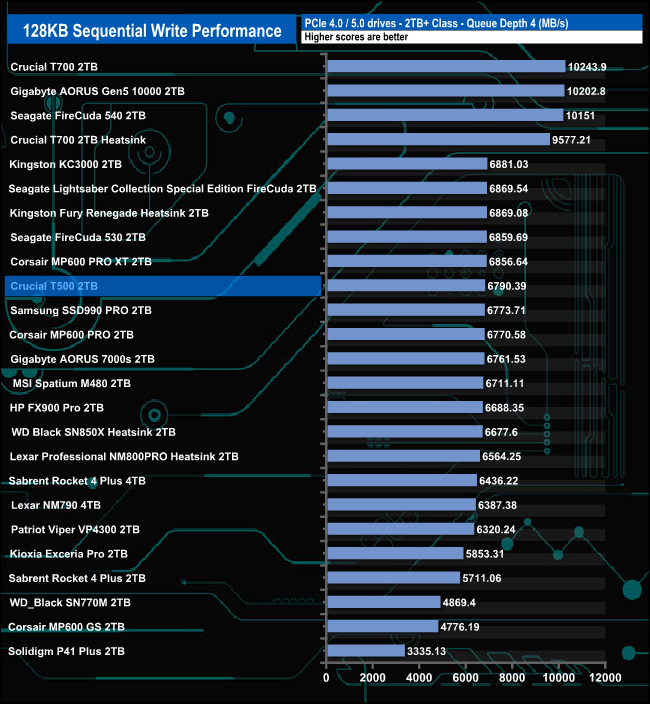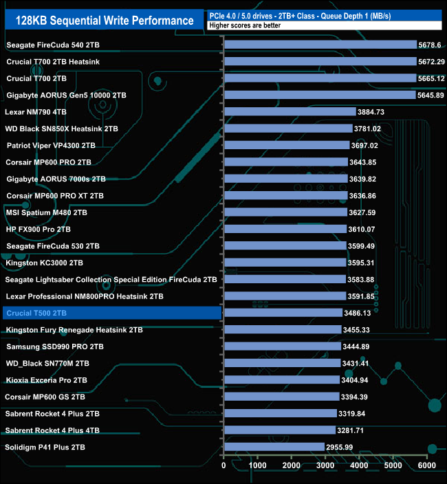 At QDs 1 and 2, the T500 is the fastest Gen 4 drive we've seen to date. At QD 4 it slips behind WD's Black SN850X heatsink drive and at QD32 it lies in a low middle position in the results table.
