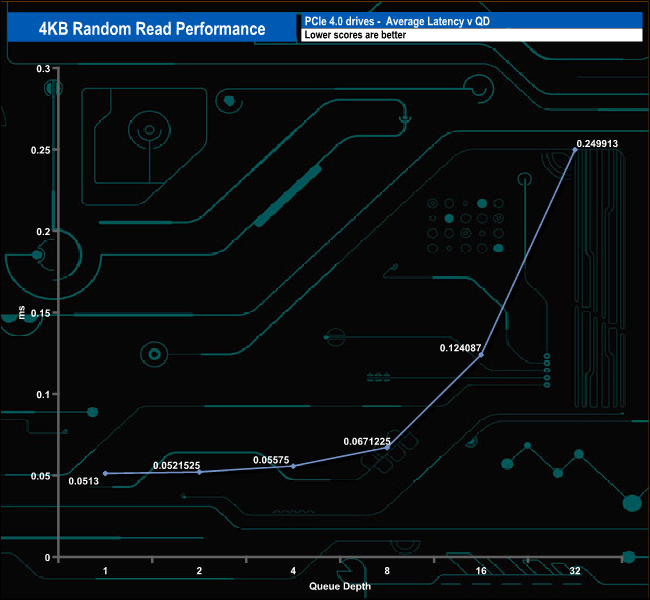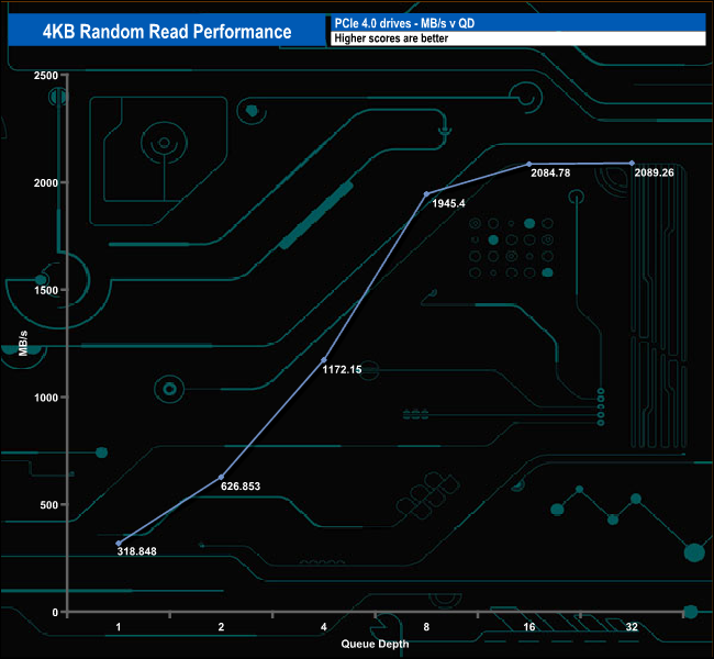 We used CrystalDiskMark 8‘s custom settings to test the 4K random read performance of the drive through a range of queue depths. The setup for the tests is listed below.