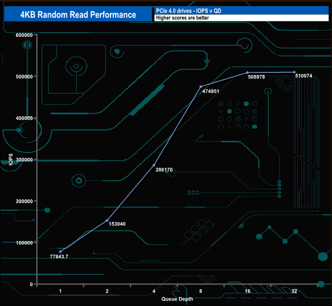 With our 4-threaded random 4K read testing we couldn't get close to the official rating of 1,180,000 IOPS with a best test result of 510,074 IOPS.