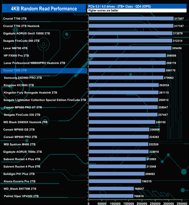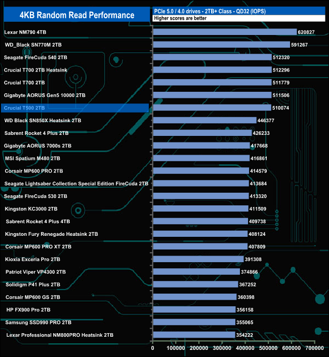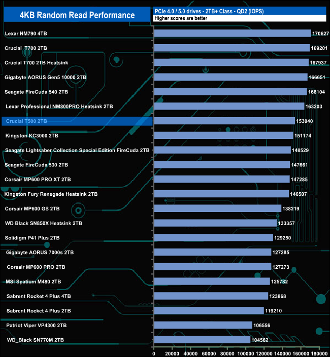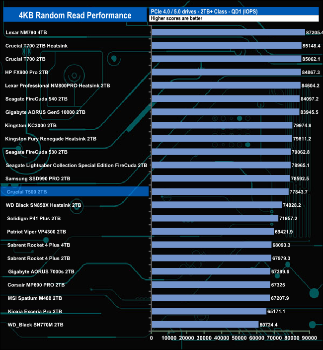 At QD1 the 2TB Crucial T500 sits in a mid-table position, however, at QD's 2, 4 and 32 it moves up to lie in the top 10 of drives tested to date.