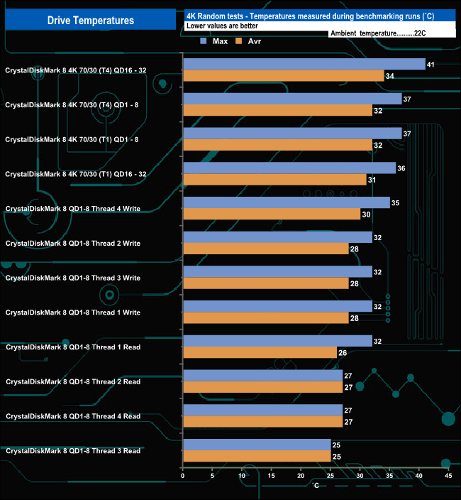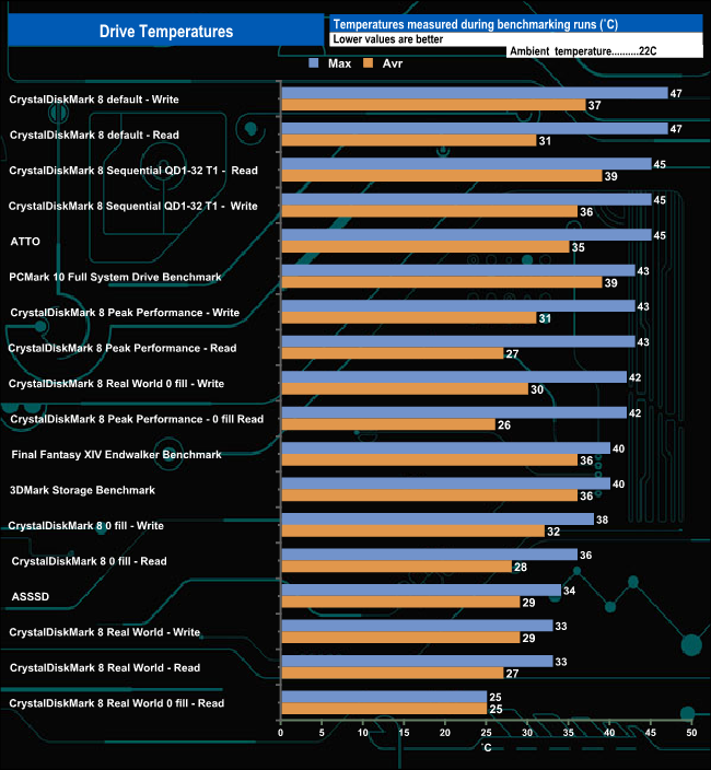 We took note of the drive’s temperature during some of our benchmarking runs. During our benchmarking runs, the hottest the drive got was 47° C during CrystalDiskMark 8 default test runs. For the non-4 K tests the drive averaged 39.72° C while for the 4K-based tests, the average was 32.72° C.