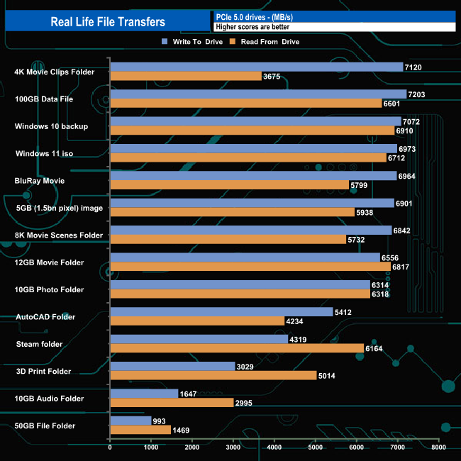 The drive averaged 5,019MB/s when writing the 14 transfer tests, with the fastest being the 7,203MB/s for the 100GB Data file transfer and the slowest being the 50GB file folder transfer at 993MB/s.