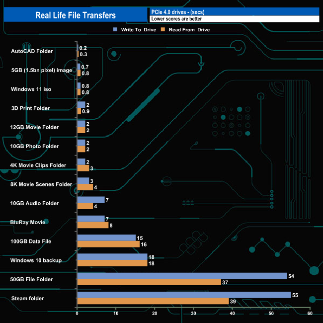 To test real life performance of a drive we use a mix of folder/file types and by using the FastCopy utility (which gives a time as well as MB/s result) we record the performance of drive reading from & writing to a 2TB Seagate FireCuda 510.