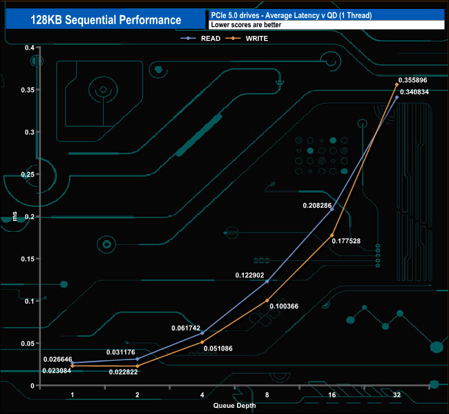 It's the same story when it comes to Sequential writes, with not much separating the two Gen 5 drives at QDs 1 and 4 with the Crucial drive pulling away in the other two tested queue depths.