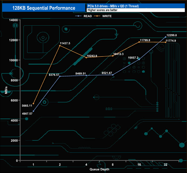 We used CrystalDiskMark 8‘s custom settings to test the Sequential read and write performance of the drive through a range of queue depths. The setup for the tests is listed below.