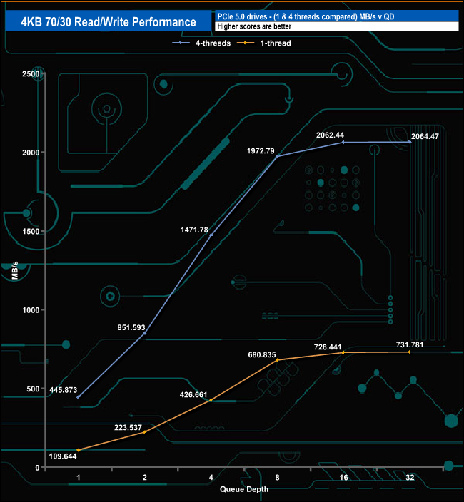 We used CrystalDiskMark 8’s custom settings to test the 4K 70/30 mixed read/write performance of the drive through a range of queue depths using a single thread and four threads.