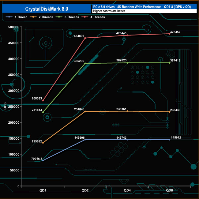 We used CrystalDiskMark 8 to test the random performance of the drive at lower queue depths (QD1 – QD8 where most of the everyday workloads occur) using 1 to 4 threads.