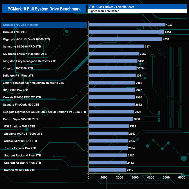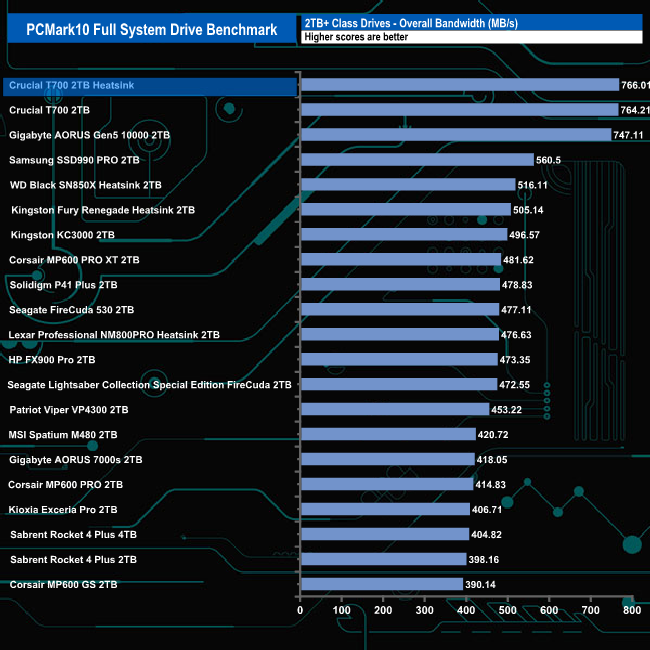 With an overall bandwidth figure of 766MB/s, the Crucial T700 Heatsink sits in top spot but only just on the results chart.