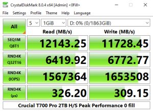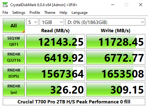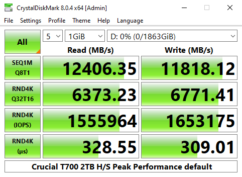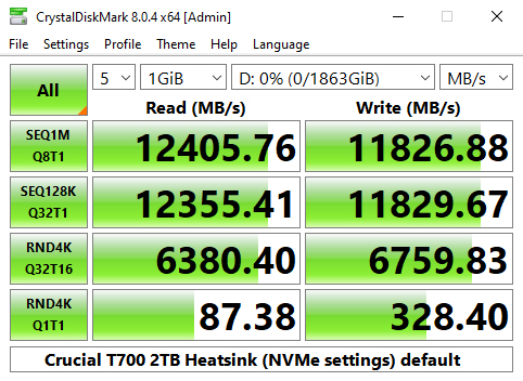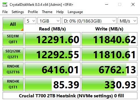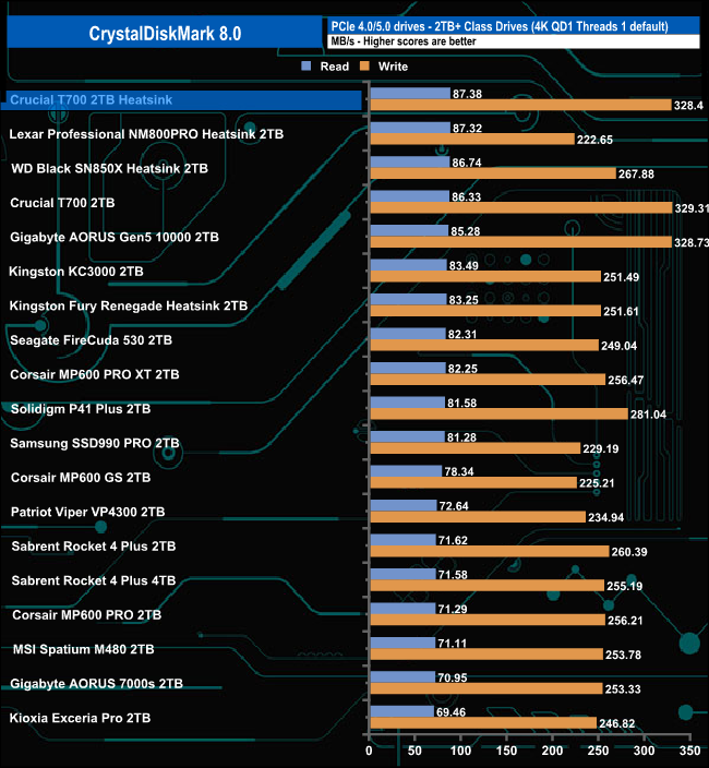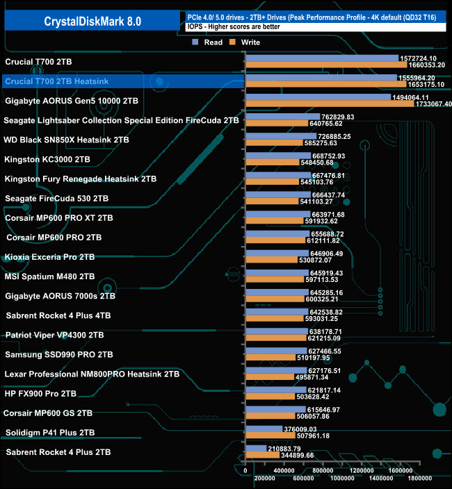 In CrystalDiskMark 8's 4K QD1 T1 test, the Crucial T700 Heatsink sits on top of the results chart thanks to its read performance which is slightly faster than the other two Gen 5 drives and the two fastest Gen 4 drives, Lexar's Professional NM800 PRO and WD's Black SN850X.