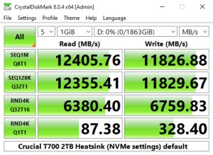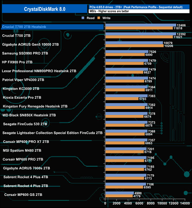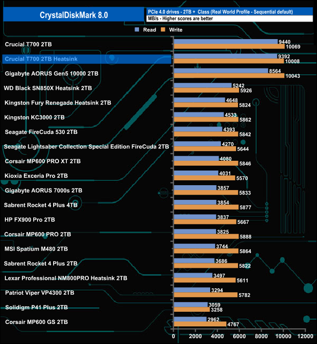 Crucial's T700 Heatsink sits just under the standard T700 in the Real World Profile chart with Sequential read/write scores of 9,392MB/s and 10,008MB/s.