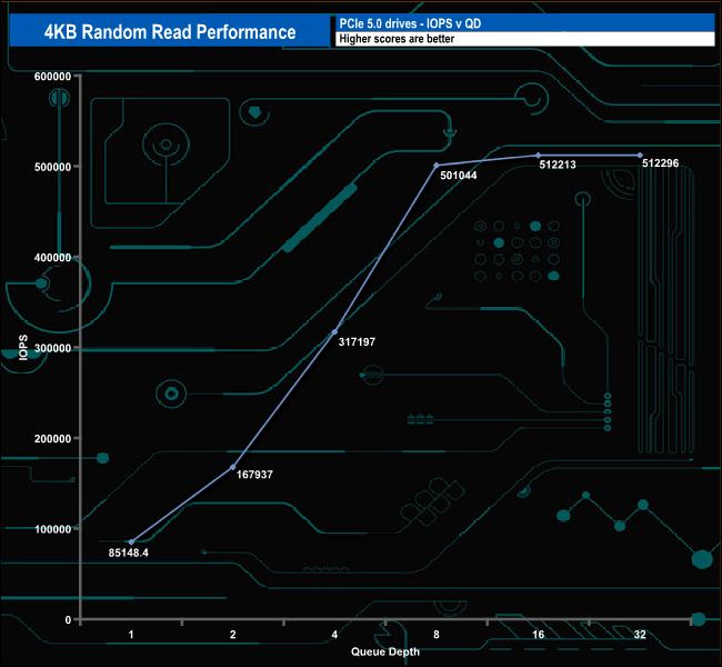We used CrystalDiskMark 8‘s custom settings to test the 4K random read performance of the drive through a range of queue depths. The setup for the tests is listed below.