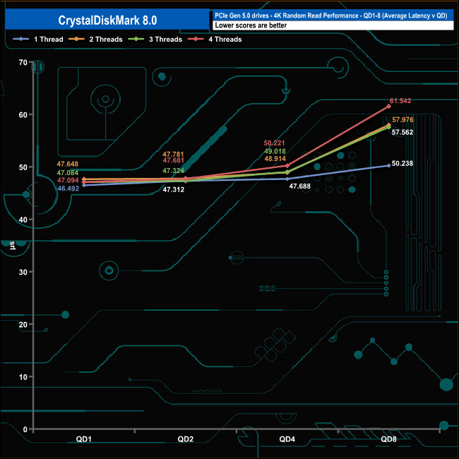 We used CrystalDiskMark 8 to test the random performance of the drive at lower queue depths (QD1 – QD8 where most of the everyday workloads occur) using 1 to 4 threads.