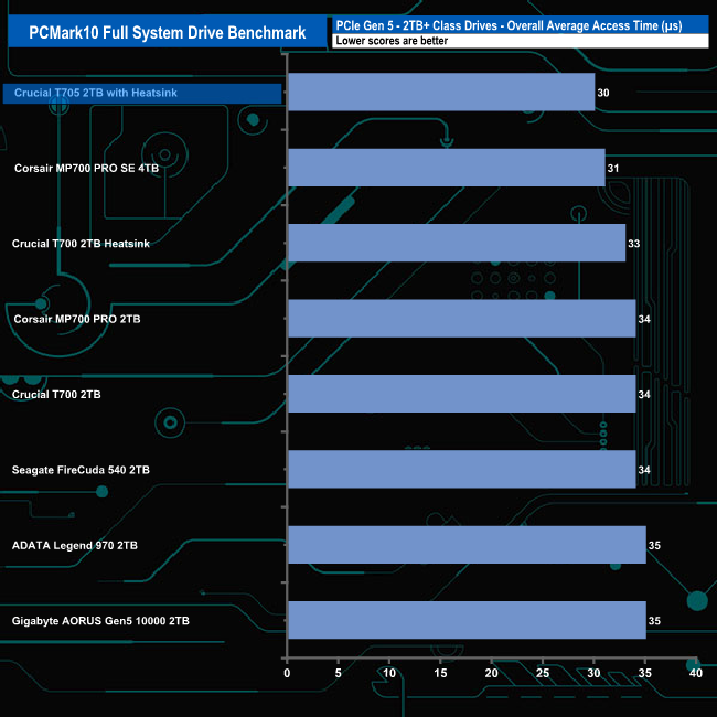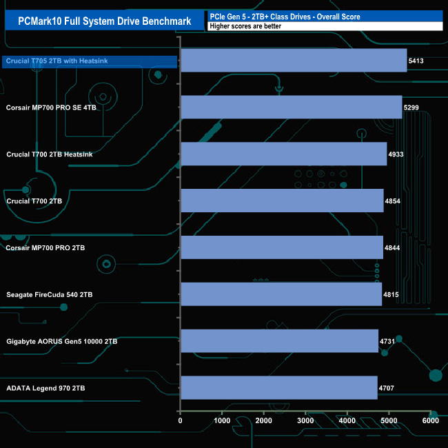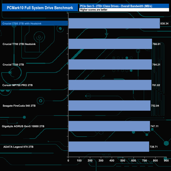 With an overall bandwidth figure of 838MB/s, the Crucial T705 with Heatsink sits in top spot some 72MB/s faster than the previous Crucial T700 with Heatsink drive.