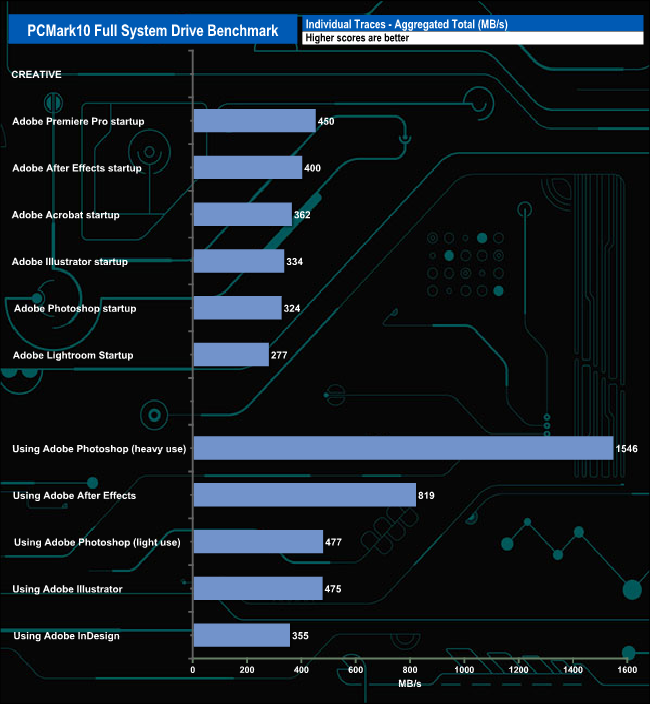 The drive averaged 357MB/s for the six Adobe startup traces, the fastest being the 450MB/s for the startup test of Premiere Pro, with the slowest being the Lightroom startup test at 277MB/s.