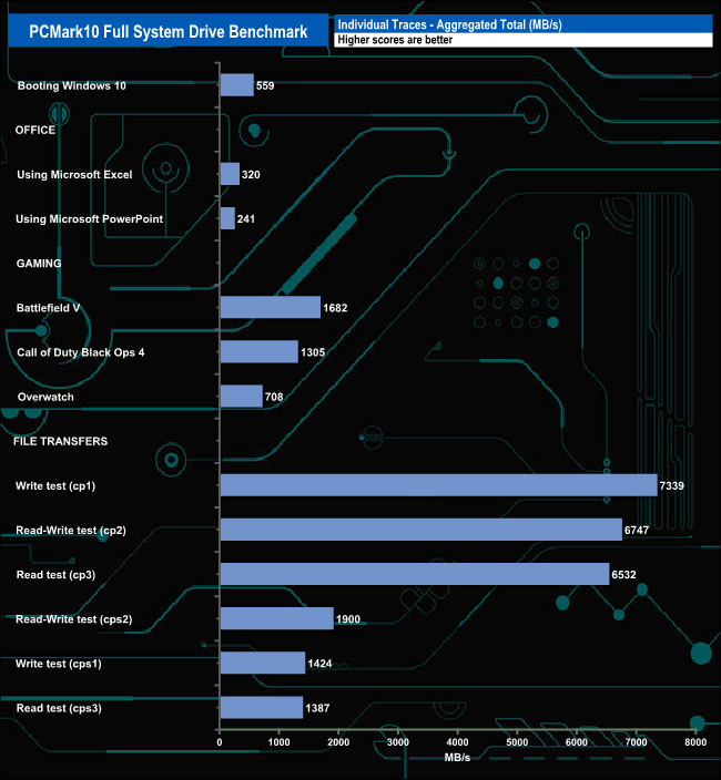 The PCMark 10 Full System Drive Benchmark uses a wide-ranging set of real-world traces from popular applications and common tasks to fully test the performance of the fastest modern drives. The benchmark is designed to measure performance of fast system drives using the SATA bus at the low end and devices connected via PCI Express at the high end.