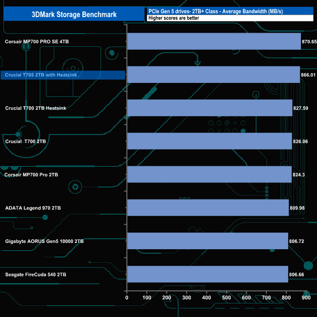 The Crucial T705 with Heatsink sits in second place in the Average Overall Bandwidth table with a figure of 866.01MB/s, just behind Corsair's MP700 PRO SE drive. The T705 is 43.06MB/s faster than the heatsink-equipped T700 and 44.06MB/s faster than the standard T700.