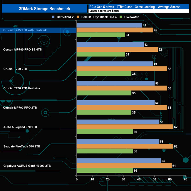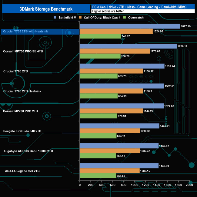 In 3DMark’s Storage Test, the drive averaged 1,299MB/s for the three-game load tests with an average access time of 41µs.The fastest load performance was for the Battlefield V test at 1,827.19MB/s (42µs), next up was Call of Duty: Black Ops 4 at 1,324.98MB/s followed by Overwatch at 746.67MB/s