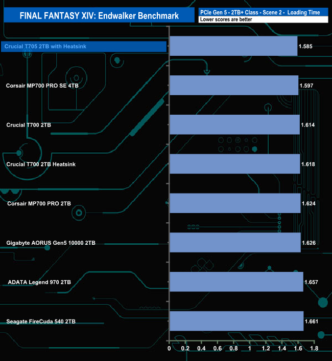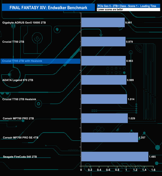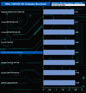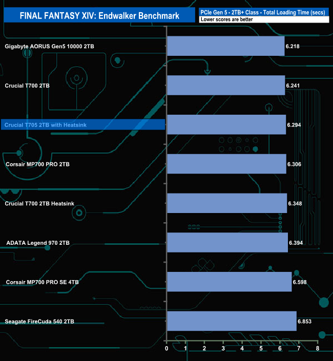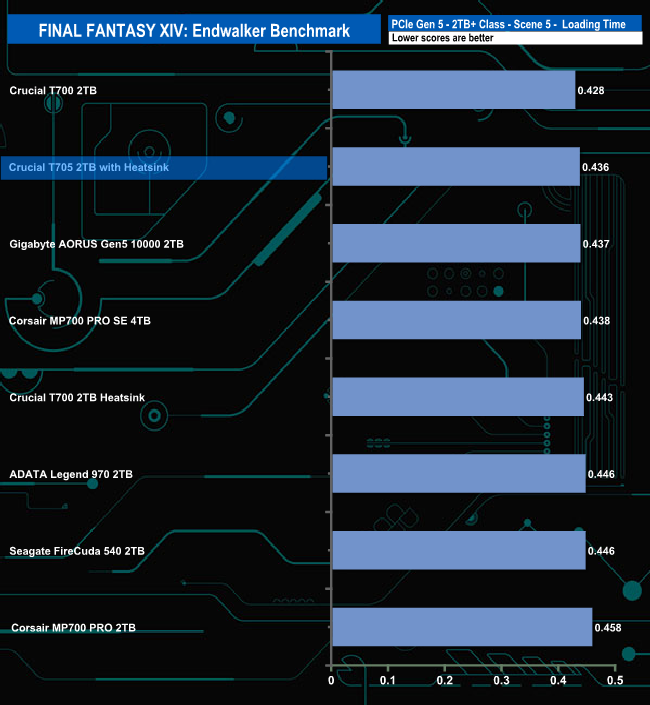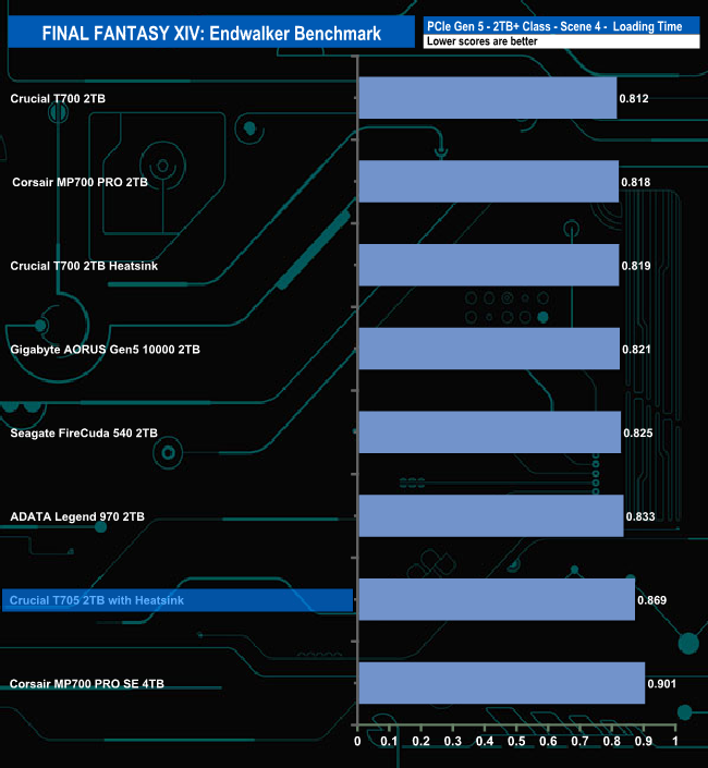 The Crucial T705 with Heatsink does ok in the Final Fantasy XIV Endwalker Official Benchmark with a mixed bag of results with scene loading times. It tops one (Scene 2), is in last but one place in another (Scene 4) and somewhere in-between for the remaining three. Overall it sits third in the Total Load Time result chart, just behind the standard Crucial T700.