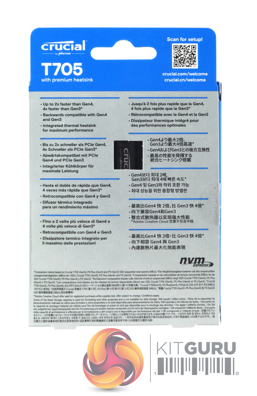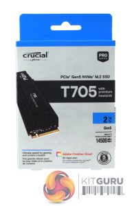 The T705 Heatsink comes in a decent quality box with a good clear image of the drive on the front. To the right of this image is a longish sticker that displays the capacity of the drive, the interface, maximum Sequential read speed and a logo stating the 5-year warranty. There's also mention of the one-month complimentary Adobe Creative Cloud personal All Apps plan (while supplies last). The rear of the box is home to some multi-lingual notes about the drive's speed, backward compatibility and the fact that it has a factory-fitted heatsink.