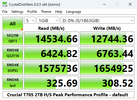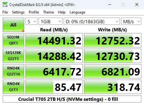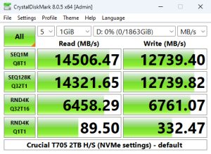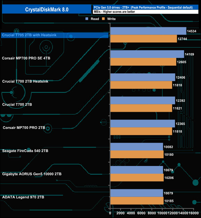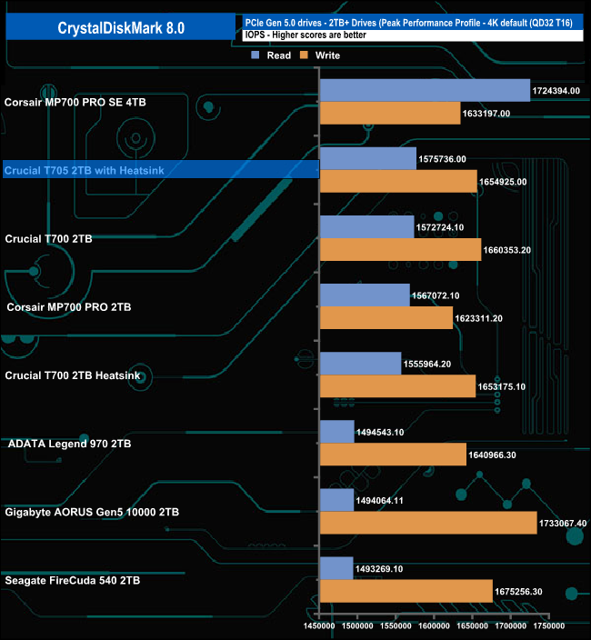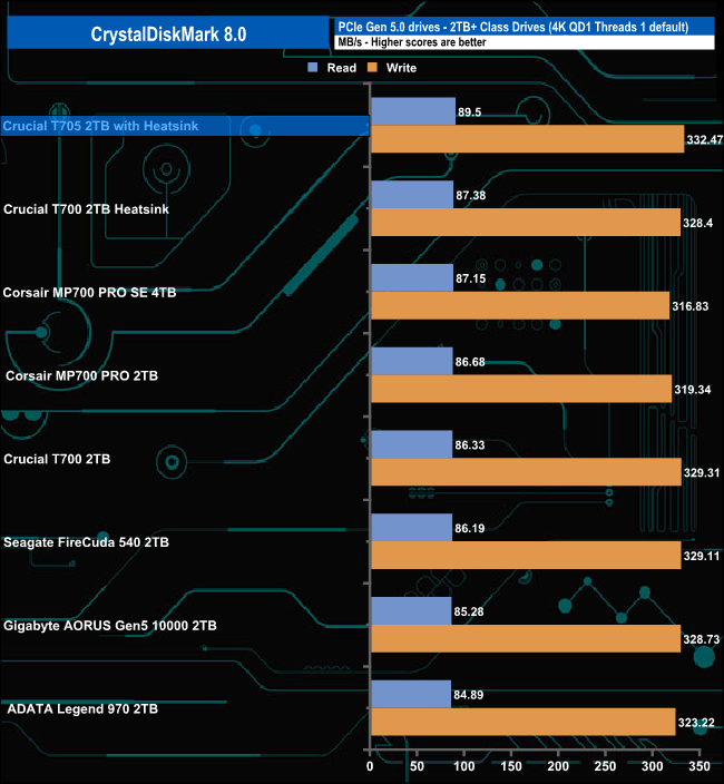 In CrystalDiskMark 8's 4K QD1 T1 test, the Crucial T705 with Heatsink takes over the top spot from the T700 heatsink version but only just, but enough to be the fastest drive we've seen to date in this test.