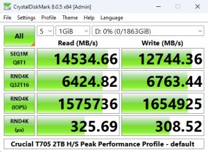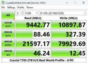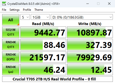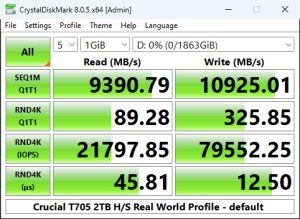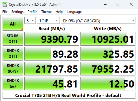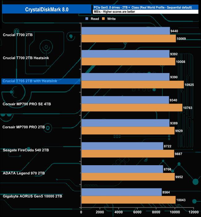 In the Real World Profile Sequential test, the T705 sits just behind the T700 when it comes to reads but the T705 has a much stronger write performance, 10,925MB/s compared to 10,008MB/s.