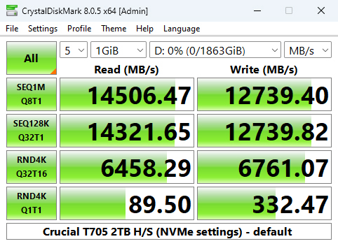 As you can see from the benchmark default result screen we can confirm the official Sequential read/write figures of 14,500MB/s and 12,700MB/s respectively with test result figures of 14,506.47MB/s for reads and 12,739.40MB/s for writes.