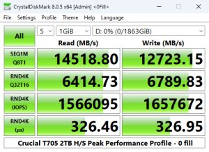 Those Sequential scores are the fastest we've seen to date for a consumer NVMe SSD. The T705 is some 2,101MB/s faster than the previous T700 for reads and 913MB/s faster when it comes to writes.