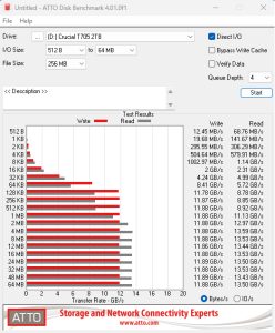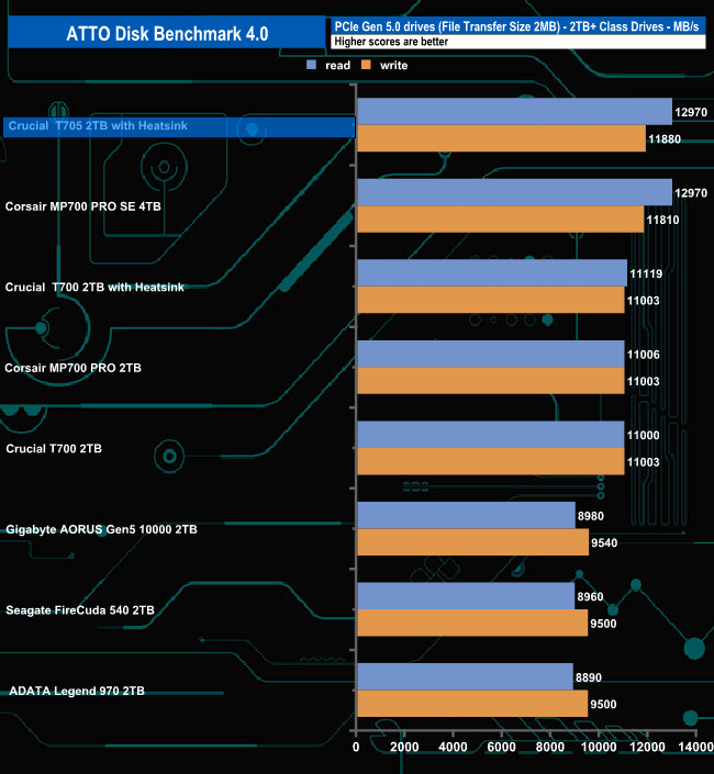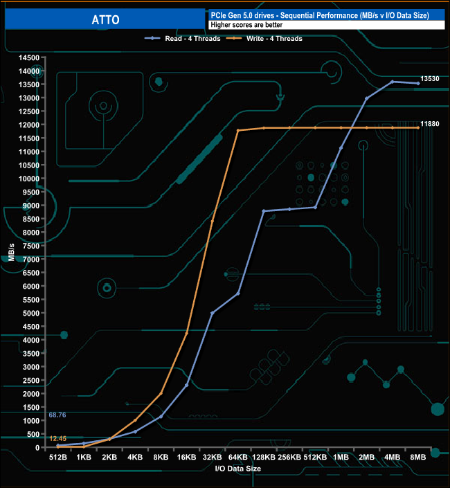 Using the ATTO benchmark we couldn't quite get to the official maximum Sequential figures of up to 14,500MB/s (reads) and 12,700MB/s (writes). However, the read-and-write results we did get, 12,970MB/s and 11,800MB/s put the drive into the top spot on the results graph.