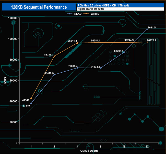 We used CrystalDiskMark 8‘s custom settings to test the Sequential read and write performance of the drive through a range of queue depths. The setup for the tests is listed below.
