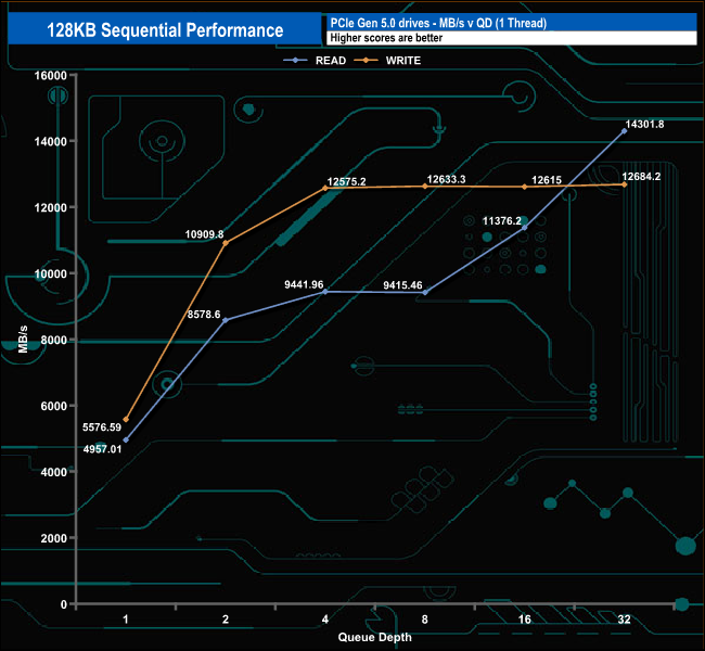 In this test, the read performance of the drive accelerates between QDs 1 and 4 before levelling off between QD4 and 8 before climbing again to finish the test run at 14,301MB/s. The write performance races away but the performance starts to plateau out at QD4 (12,575.2MB/s), finishing the test run at 12,684.2MB/s.